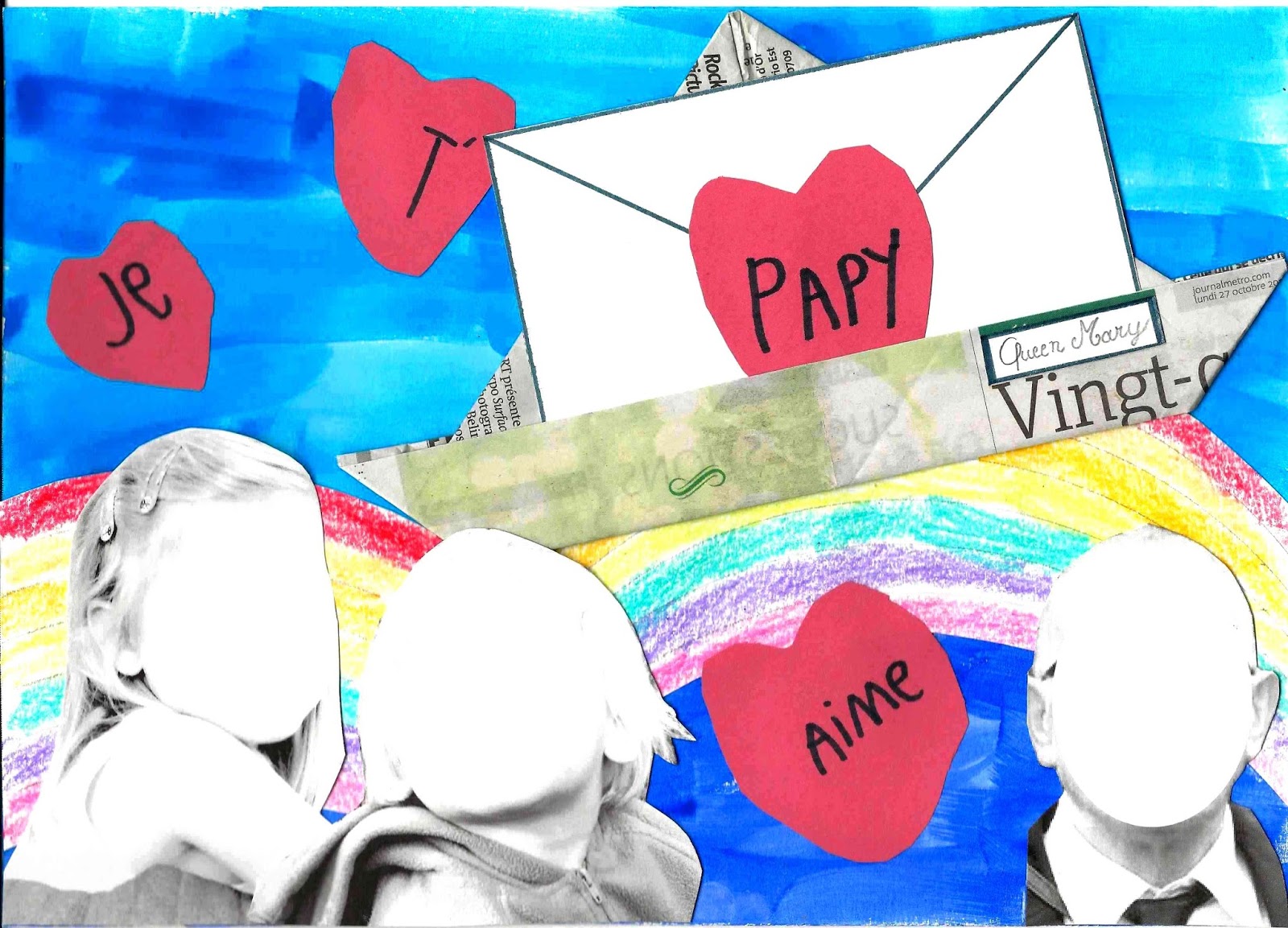 J’ai sélectionné une photo de chacun de mes enfants et une de mon père. Philtre noir et blanc, touches de contraste, collage sur papier Canson et découpage. Pour le blog, j’ai caché les visages. J’ai trouvé l’inspiration sur SmART Class, le superbe blog de Natalie, prof d’art aux États-Unis.