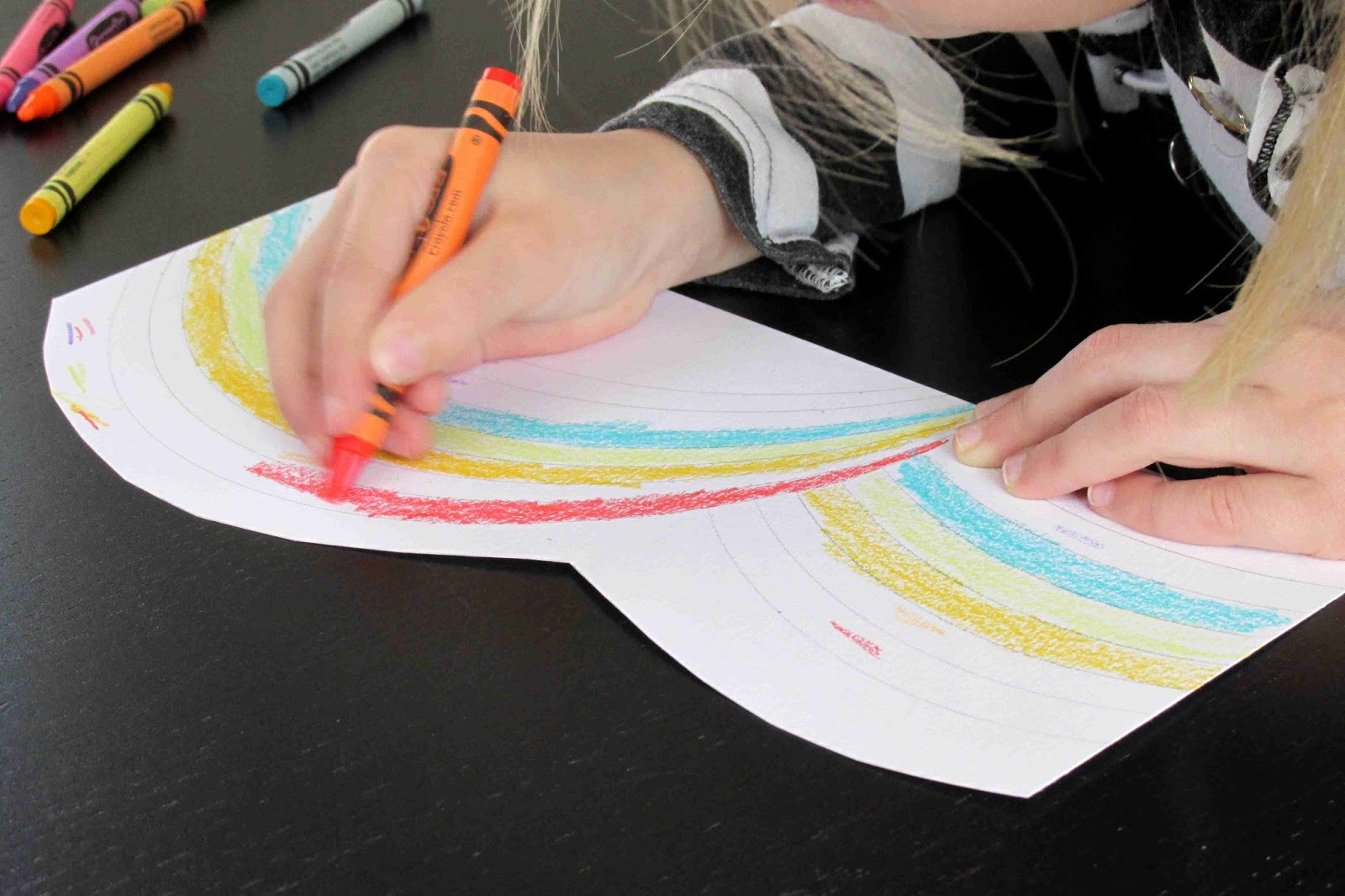 Beaucoup de travail pour Le Chameau mais fait dans la joie, ben oui c’est pour Papy… Donc colorier l’arc-en-ciel avec des crayons gras, peindre une feuille Canson à la peinture à l’eau en bleu clair et bleu foncé. Écrire les mots au crayon noir et découper des cœurs avec ces mots. Écrire le message sur la carte (celle dans le bateau) et l’adresse postale sur l’enveloppe. Et moi, découper une feuille blanche pour l’encadrement, plier le bateau, écrire le nom du bateau, procéder au collage final et fignoler les détails.