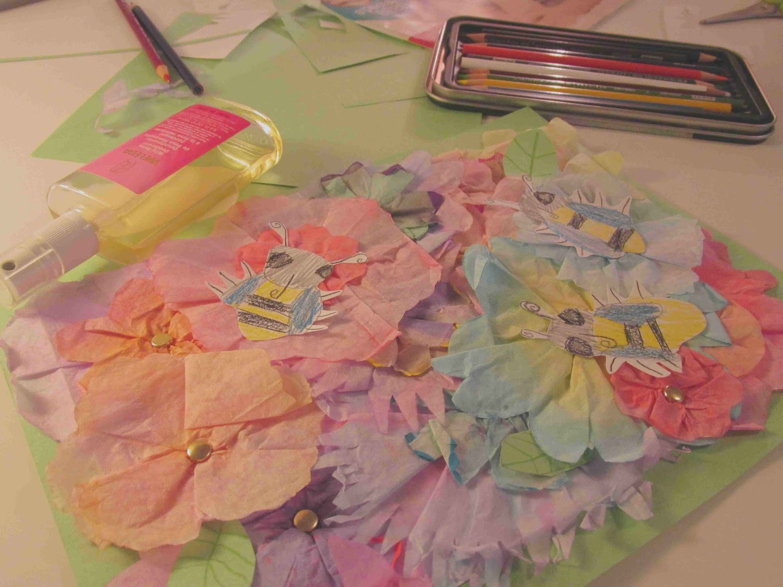 Une fois sèches, les fleurs ont été fixées à une feuille de papier Canson à l’aide de petites attaches parisiennes. Le Chameau a ensuite dessiné des abeilles, je les ai découpées. Elle les a collées à la colle d’écolier puis a collé à l’arrière une feuille verte qui fait office de pelouse.À l’arrière, il fallait bien écrire le titre du bricolage et le nom de l’auteur. Chose faite avec une autre feuille de papier Canson collée au verso du bricolage.