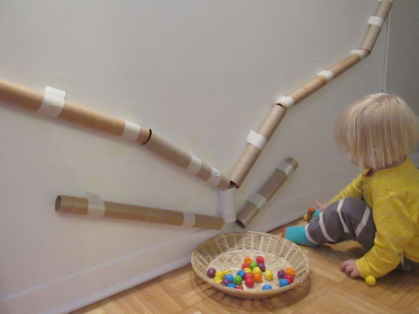 Avec un long tube de carton tenu en son milieu par une ficelle, à la hauteur de l'enfant, j'avais dans le même esprit fait un jeu avec des marrons à faire atterrir dans des pots et il fallait viser (le tube n'était pas fixé au mur…).