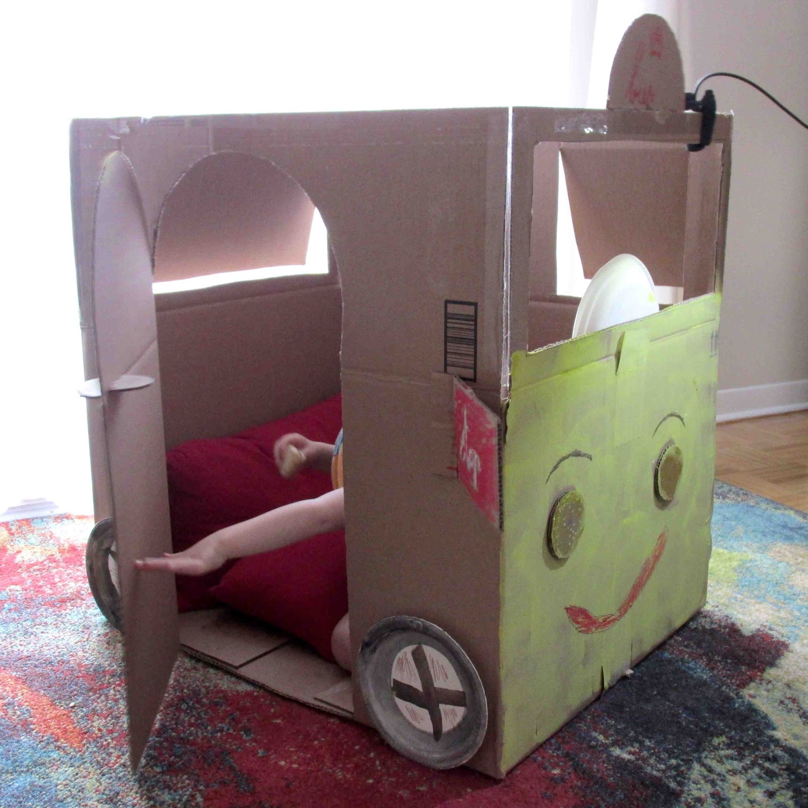 Le Crapaud aime chanter la chanson « les roues de l’autobus », la version en anglais de préférence. Le Chameau s’est dépêchée de lui fabriquer un bus scolaire, jaune en Amérique du Nord – nous n’avions pas assez de peinture – pendant sa sieste avec une grosse boîte reçue le matin même et quelques assiettes en carton. J’ai découpé le carton selon ses directives. Une gentille attention qui leur aura permis de jouer plusieurs jours au conducteur de bus.
