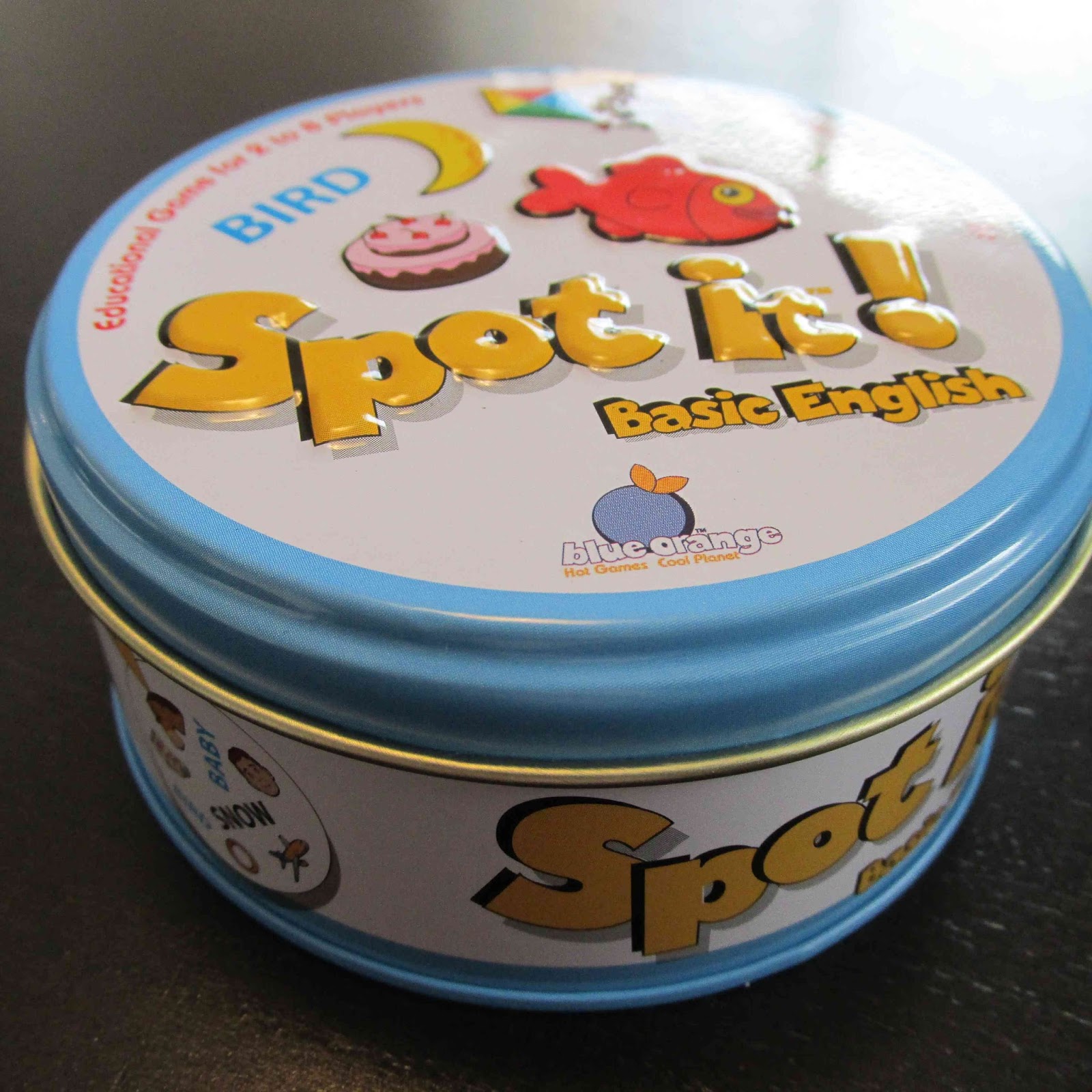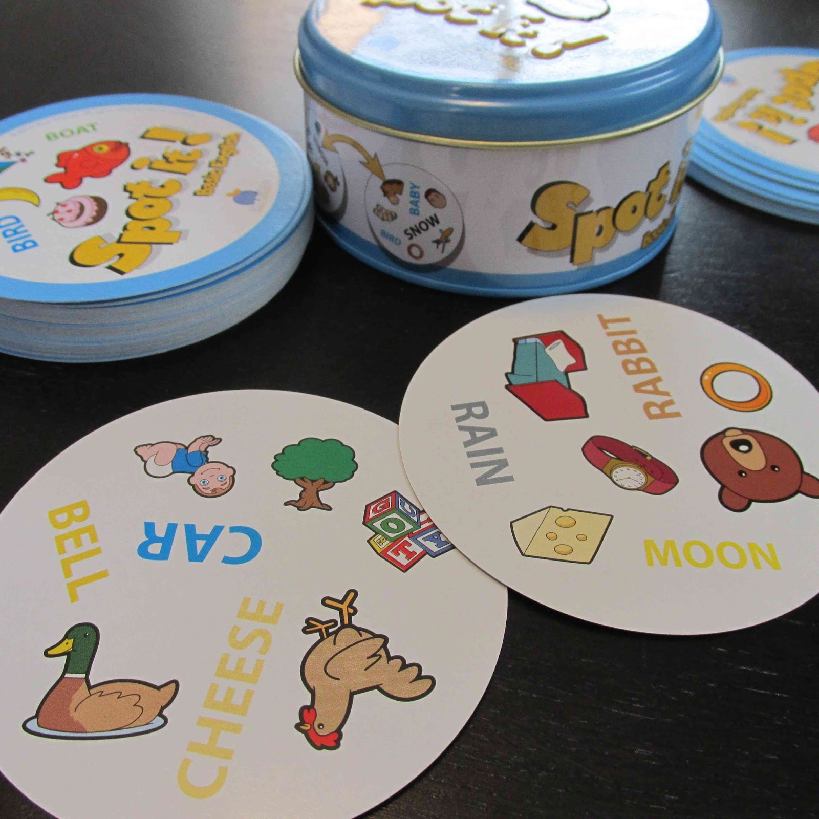 Observation, déduction, rapidité, ce sont des fiches cartonnées rondes qu’il faut associer le plus rapidement possible. Un moyen d’enrichir le vocabulaire de l’enfant et de prendre le temps de parler exclusivement en anglais durant le jeu, c’est une règle que l’on s’est imposées, le Chameau et moi. Il y a différentes façons d’y jouer, l’une d’elles consiste à retourner deux cartes en même temps, chacun son tour, et à y trouver le même élément. Essayez avec l’exemple photo ci-dessous, réponse en fin d’article. Ne trichez pas !