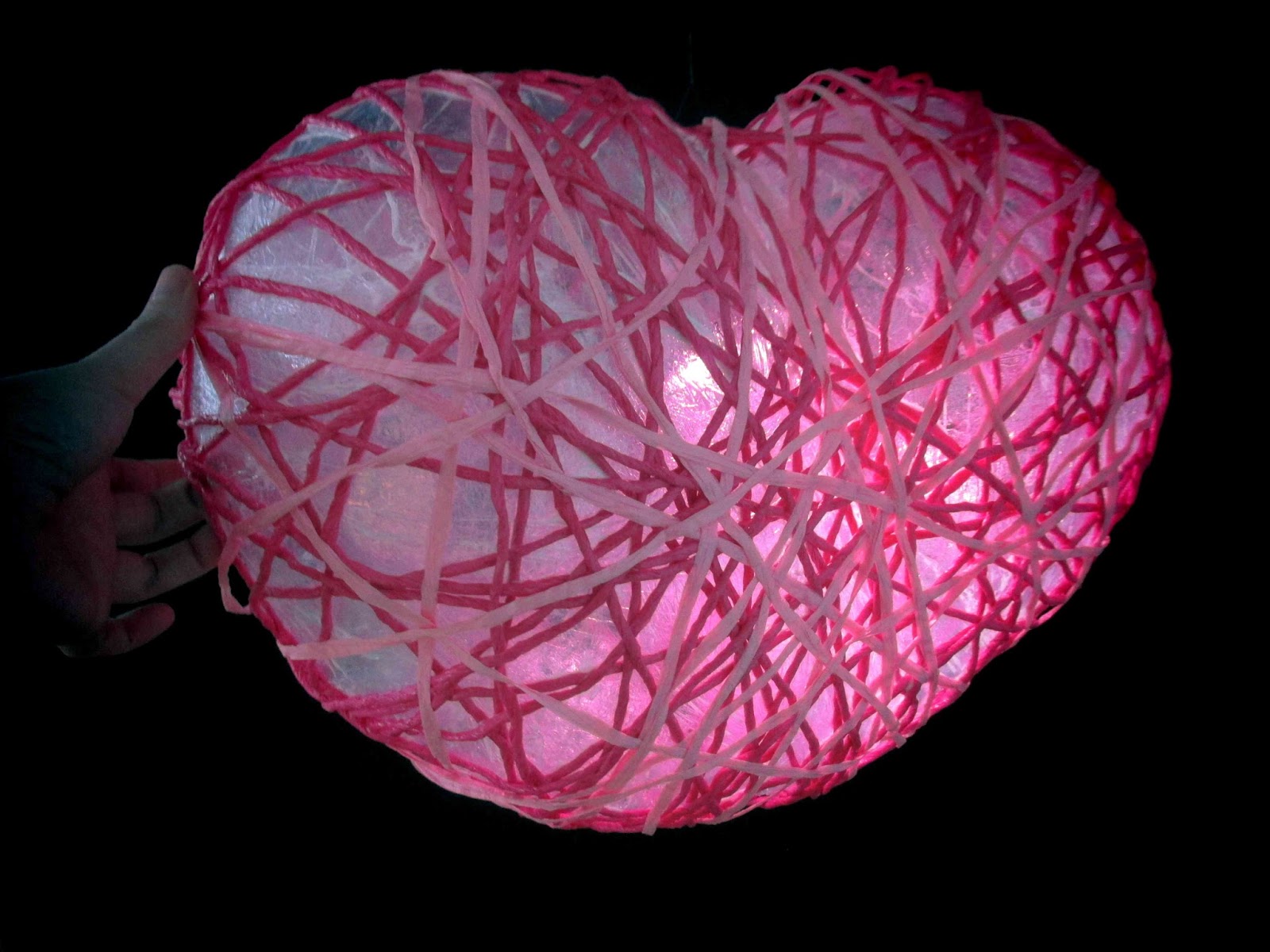 4ème étape : laisser sécher ou, pour les pressés comme Le Chameau et moi, sécher au sèche-cheveux. Sur le côté, découper le film, dégonfler les ballons et « vider le cœur » en glissant une paire de ciseaux pour découper des morceaux des ballons-ruban à masquer-gobelet. Fixer une petite lampe et pour faire vraiment St-Valentin, la recouvrir de papier de soie rose.