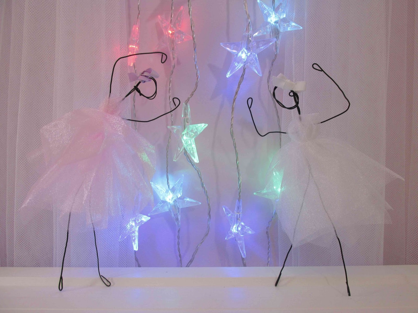3.b Version simple : habiller le personnage, ici avec de la tulle. Vous pourriez habiller le personnage avec du papier, des bouts de tissu récupérés, de feuilles mortes…Vous savez comme je n’aime pas coudre, je suis donc allée au plus simple. Découper une bande assez large de 2 fois la longueur voulue, la replier, faire 3 trous sur le haut pour passer la tête et les bras. Serrer à la taille pour faire une robe et nouer avec du fil transparent. Pour un effet tutu, nous avons superposé 4 couches de tulle.