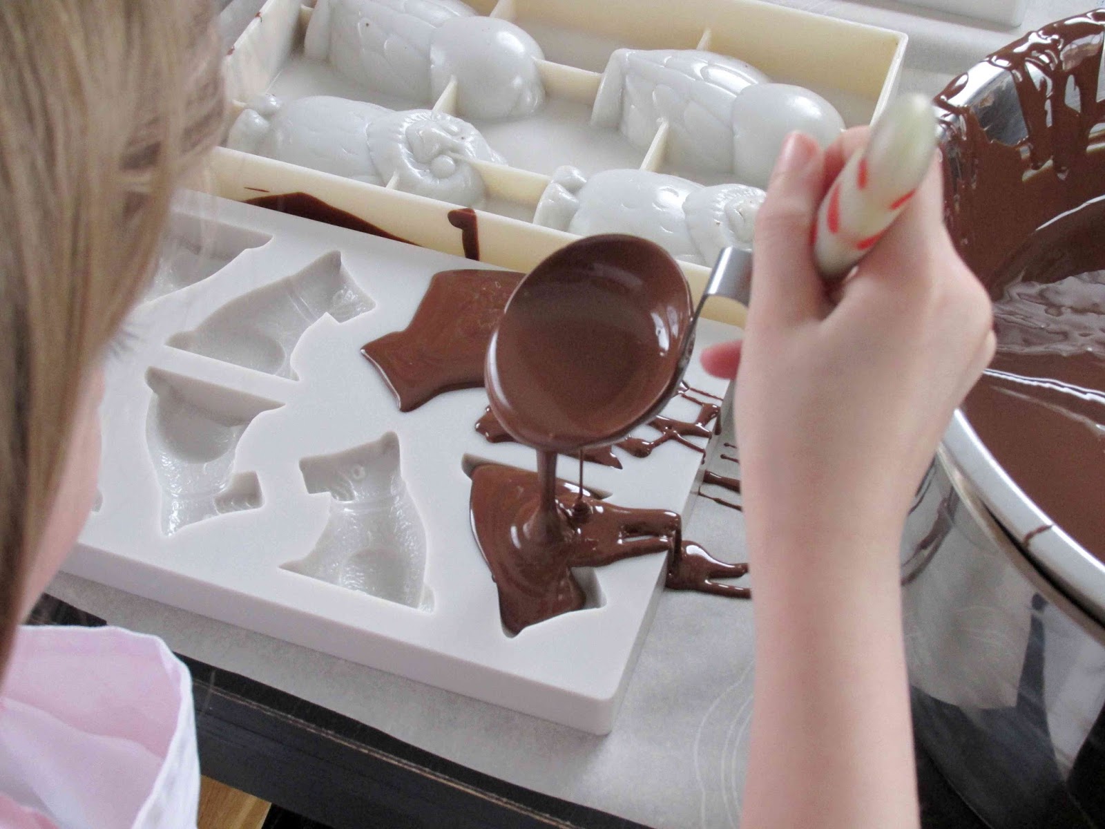 À défaut de pouvoir vous faire sentir les bonnes odeur de chocolat fondu, je vous montre en photo l’atelier chocolat que Papa Crapaud Chameau a fait faire à nos gourmands. Choisir du vrai chocolat, le cristalliser, le mouler et l’assembler : nos petits chocolatiers ont fait ça comme des pros !