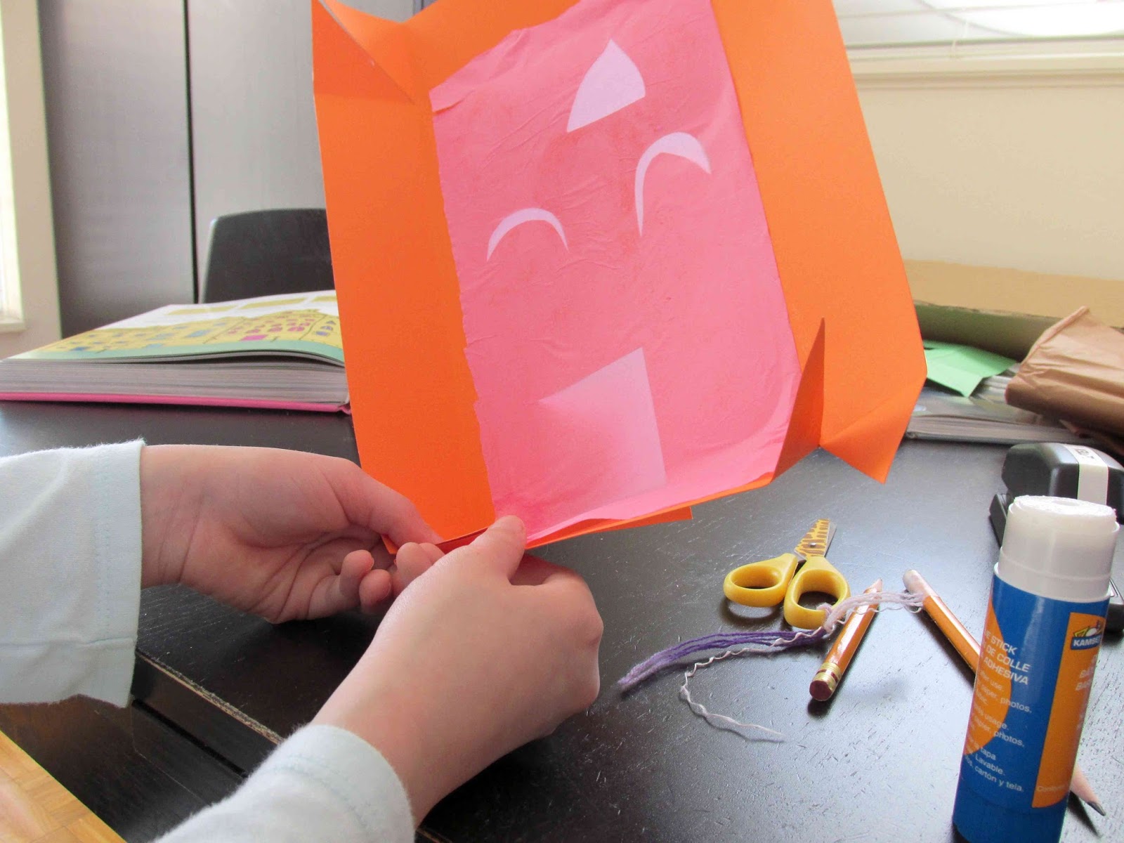 Pour ce bricolage, nous avons eu besoin de feuilles colorées cartonnées, de papier de soie et de papier calque, d’une grande règle, d’une paire de ciseaux, d’un crayon de bois, d’un exacto (cutter), de colle, d’une agrafeuse, d’un grand morceau de carton, de peinture bleue, verte et blanche et d’un grand pinceau.