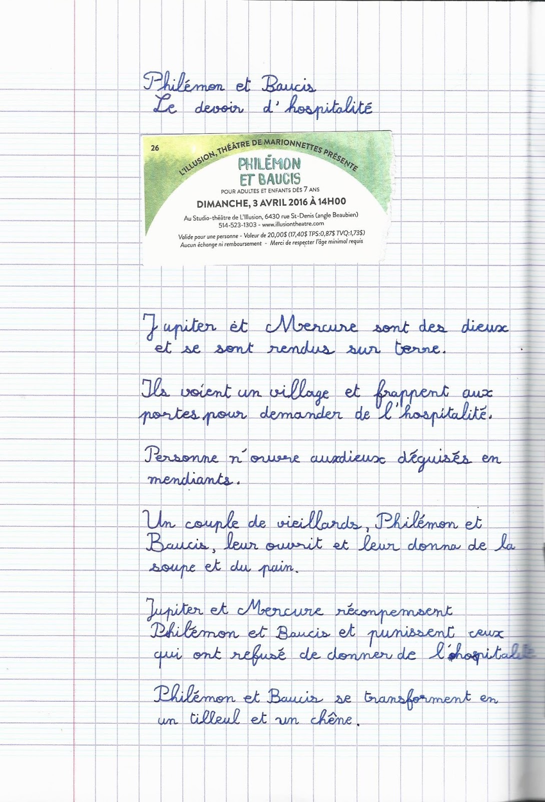 | Le mythe résumé par Le Chameau sur son Cahier des histoires à raconter |