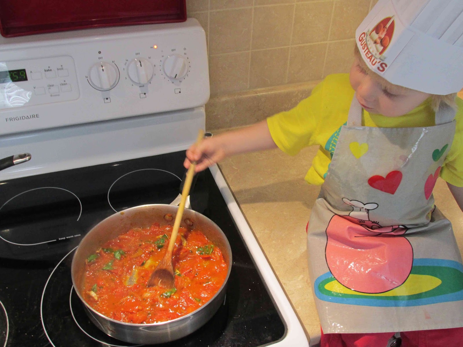 Après le couteau, la cuisinière… Vous allez finir par me prendre pour une mère indigne. À vrai dire, je pense que je le serais si je ne laissais pas le Crapaud expérimenter son intérêt pour la cuisine. Je ne mesurais pas à quel point il est important pour l’enfant de réaliser par soi-même des choses que, à l’époque, je trouvais trop dangereuses. C’est un regret que j’ai par rapport au Chameau. Le voilà donc ce p’tit chef saucier sur le comptoir, à remuer la sauce tomate pour sa ratatouille à cuire au four.