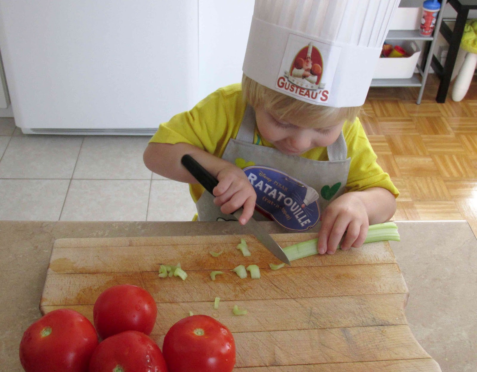 Le Crapaud est aux anges quand il peut faire la cuisine. C’est une véritable source de joie et d’excitation et il faut dire que pour son âge, il est dégourdi. Alors oui, je le laisse couper les légumes avec un vrai couteau, comme vous le voyez ci-dessous. Je reste tout près et retiens le moindre geste trop enjoué. Ce n’est pas quelque chose que je faisais avec le Chameau au même âge, j’aurais été inquiète. Le Crapaud, du haut de ses 3 ans, prend la cuisine très au sérieux.