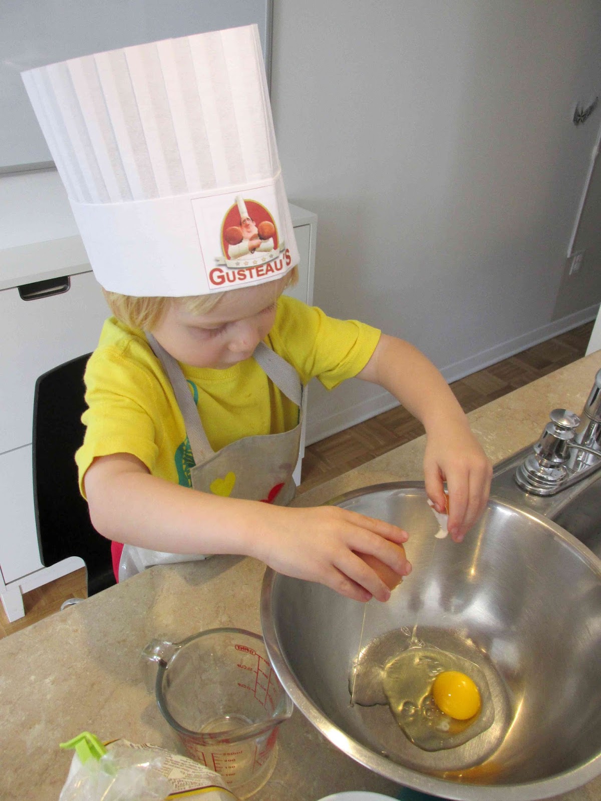 Ha, casser des œufs. C’est la guerre fratricide lorsque la recette en compte un nombre impair. Pour cette fois, les œufs ne devaient pas être clarifiés (séparer le jaune du blanc). À 3 ans, le Crapaud sait le faire. Quand je vous dis qu’il est doué !