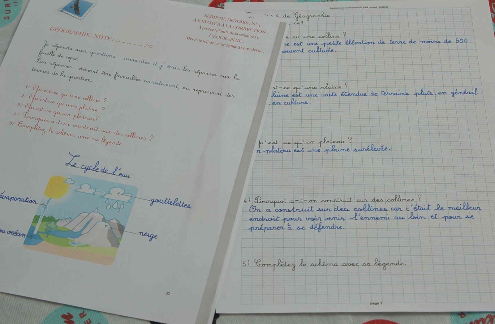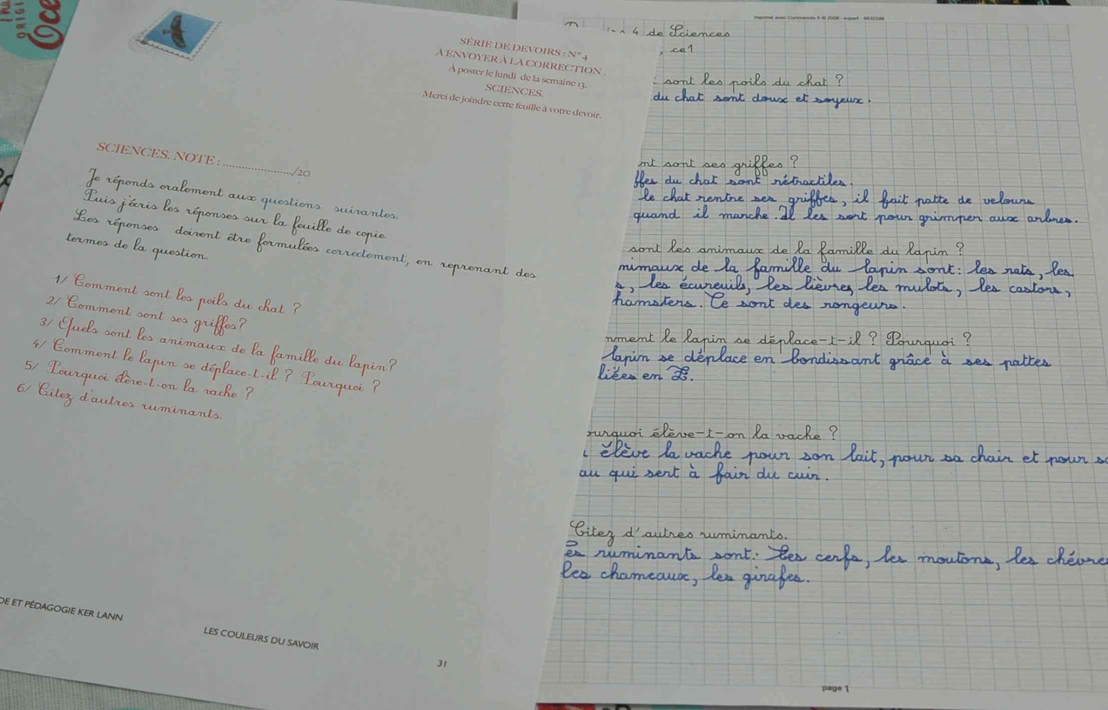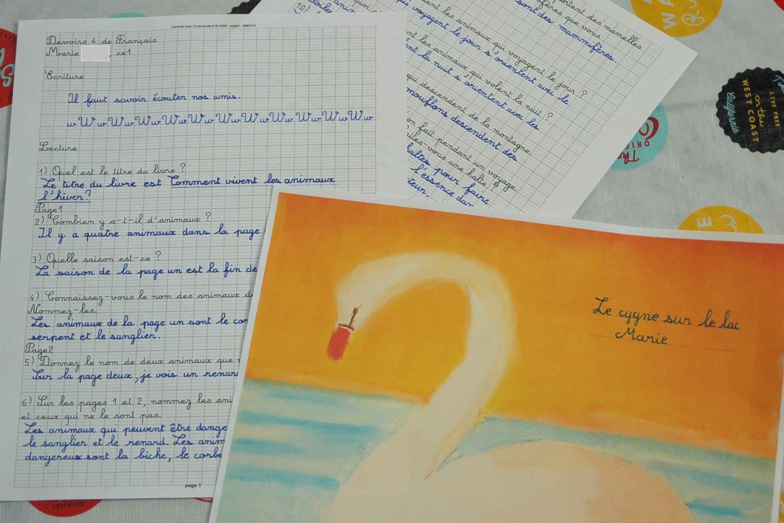 Dès qu’une série est terminée, je prépare la série suivante. Plutôt que d’acheter des feuilles mobiles à lignage Séyès, ce qui me coûterait cher car indisponibles ici, je préfère taper à l’ordinateur en noir et blanc les consignes depuis le site Cursivécole. Comme je sais TipTapToper, ça va super vite. Je les enregistre sur mon PC et les aurai pour mon fils plus tard (autant éviter le doublon de travail). Cette préparation me permet de savoir à l’avance quelles sont les notions évaluées par les devoirs et donc, de préparer au mieux ma fille. Pour l’Anglais, je me contente de photocopier les feuilles des consignes à compléter. Pour certains devoirs de DDM, je photocopie la feuille des consignes lorsqu’il faut y compléter un schéma par exemple.