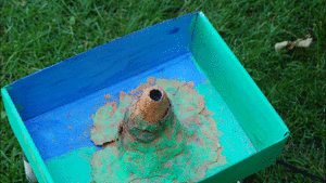 J’ai inséré le sèche-cheveux dans le volcan et l’ai mis en position « on », sans le brancher. Le Chameau a versé les cendres dans la cheminée du volcan à l’aide d’un entonnoir. Elle a ensuite branché le sèche-cheveux à la rallonge (à faire dehors !) et tadam !Un gif pour vous montrer notre volcan en éruption…