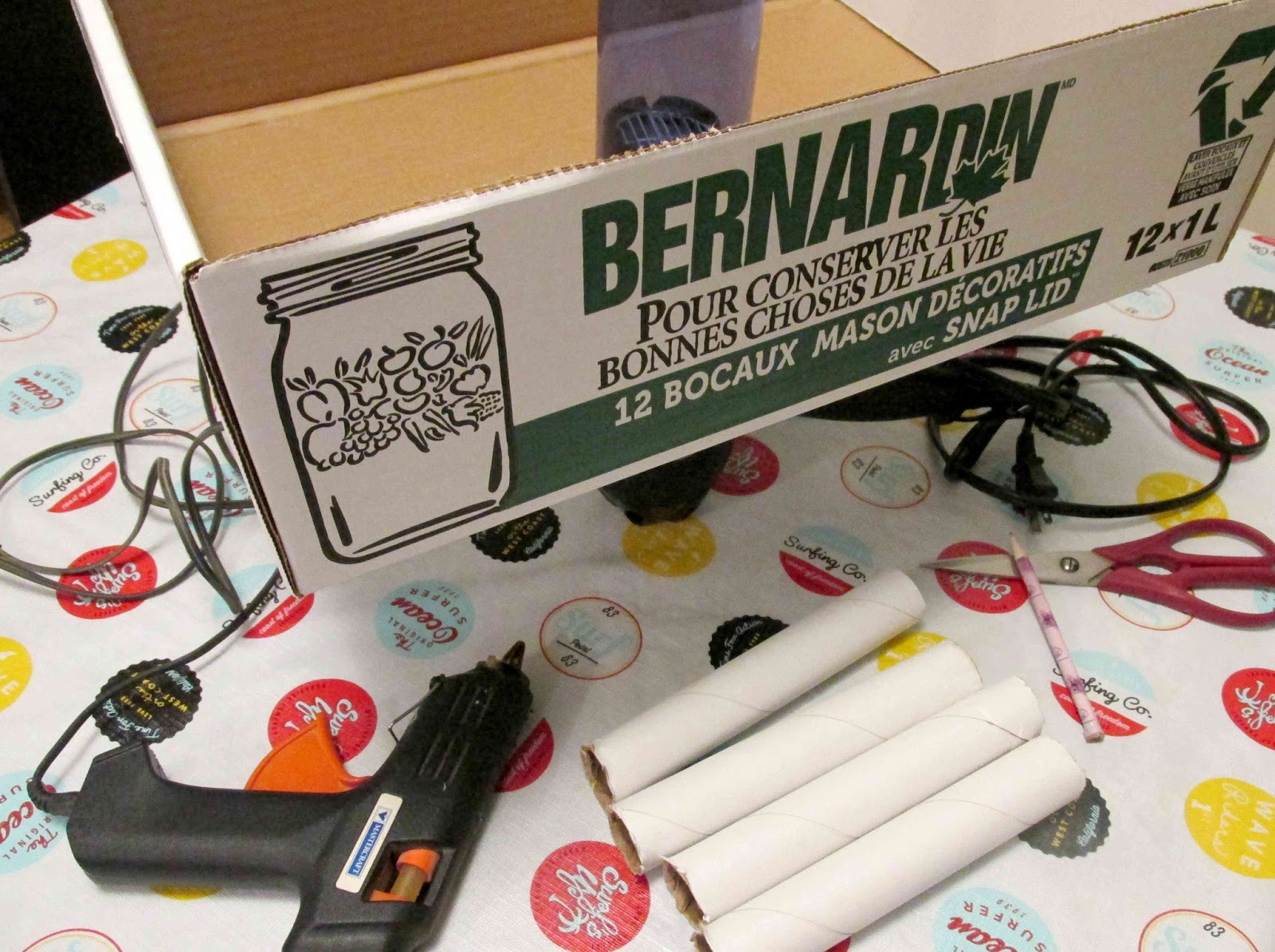 Dans un carton, j’ai découpé au centre un cercle quelques millimètres plus large que le diamètre de mon sèche-cheveux. Vous me voyez venir ? J’ai ensuite découpé le fond d’une petite bouteille en plastique du même diamètre ou à peu près que celui du sèche-cheveux. J’ai fabriqué à partir de reste de rouleaux de papier essuie-tout des pieds pour élever le socle-carton et qu’il tienne lorsque l’on insère le sèche-cheveux dans le trou du centre.
